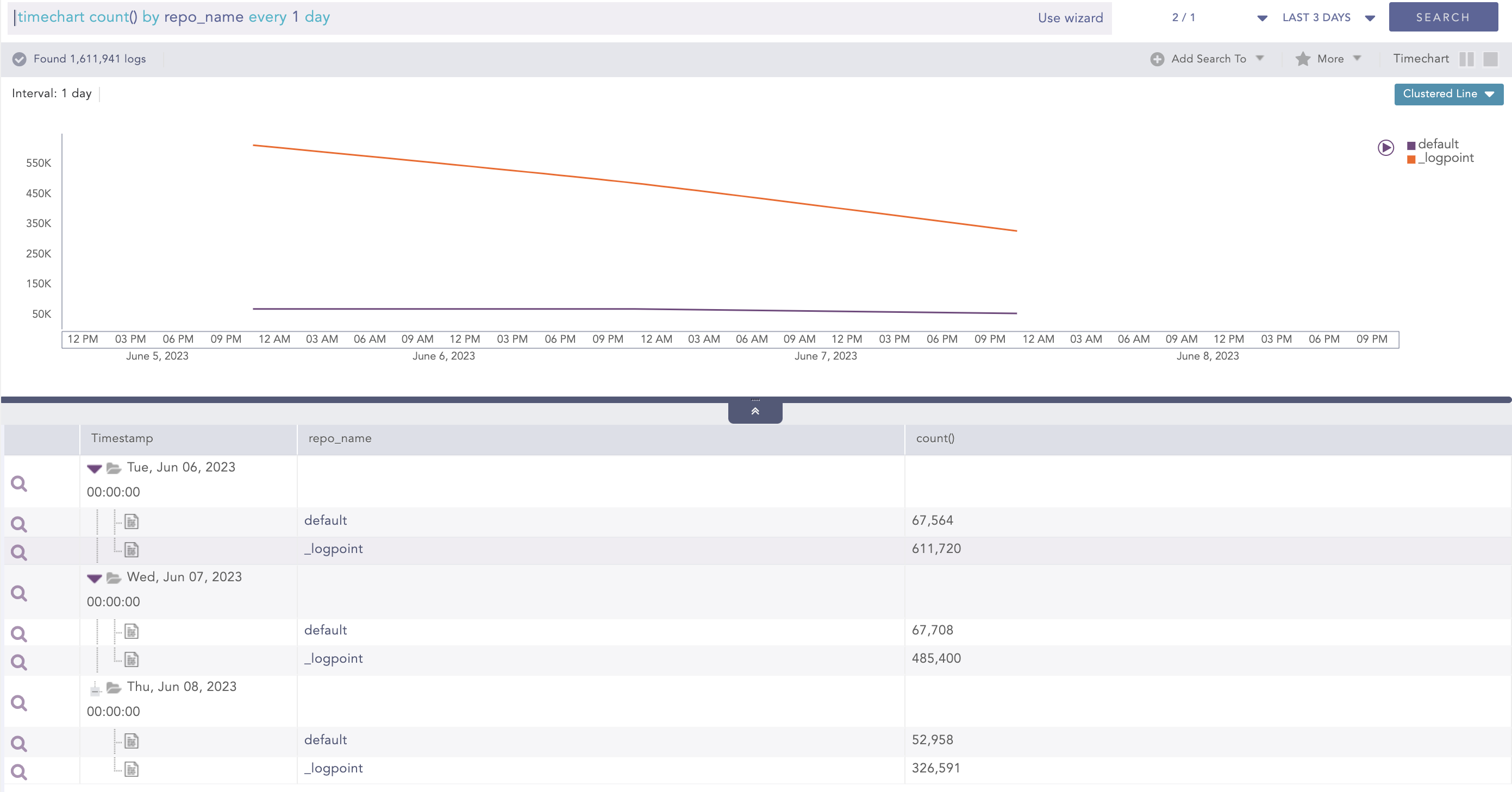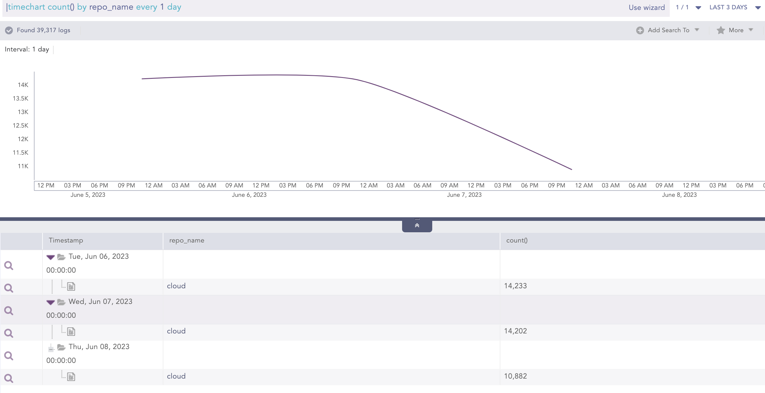 Unfortunately, it is not currently possible to directly compare the results of the same query for different time slots within a single search. However, for your specific use case, you can utilize the following query: "|timechart count() by repo_name every 1 day" with the desired time range. This will allow you to view and compare the number of logs you are receiving for a particular repository each day. I recommend avoiding the selection of a large time range encompassing all repositories at once, as it may impact the system's performance. To ensure optimal performance, you can run or create a widget using the provided query, selecting a specific repository for analysis.