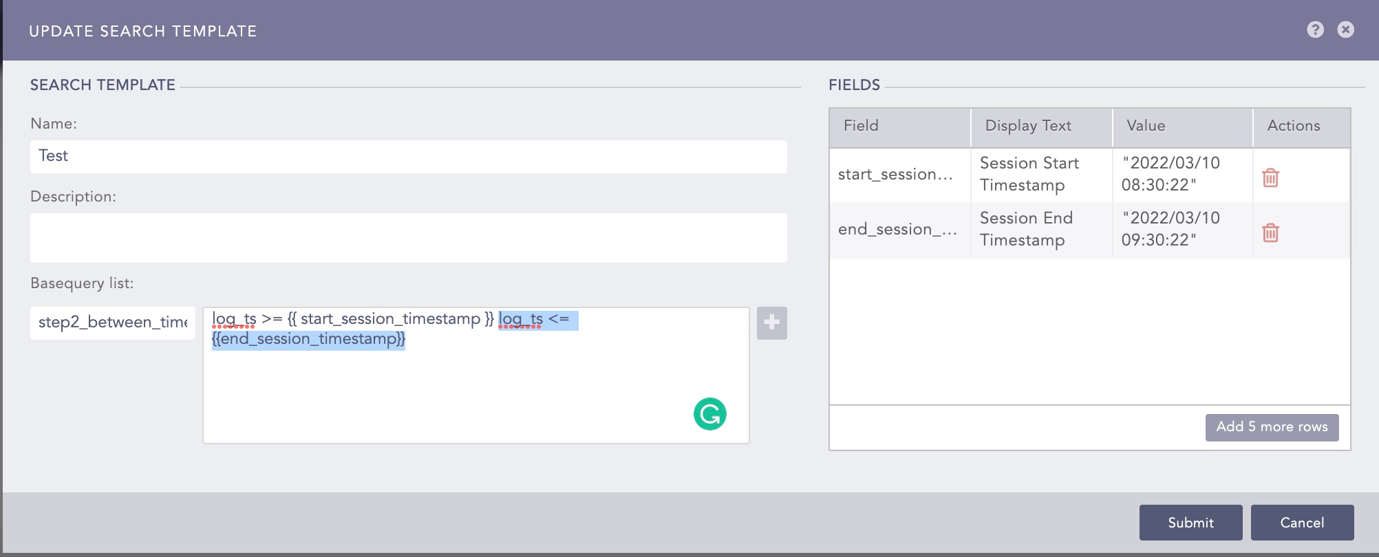 log_ts >= "{{ start_session_timestamp }}" log_ts <= "{{ end_session_timestamp }}"