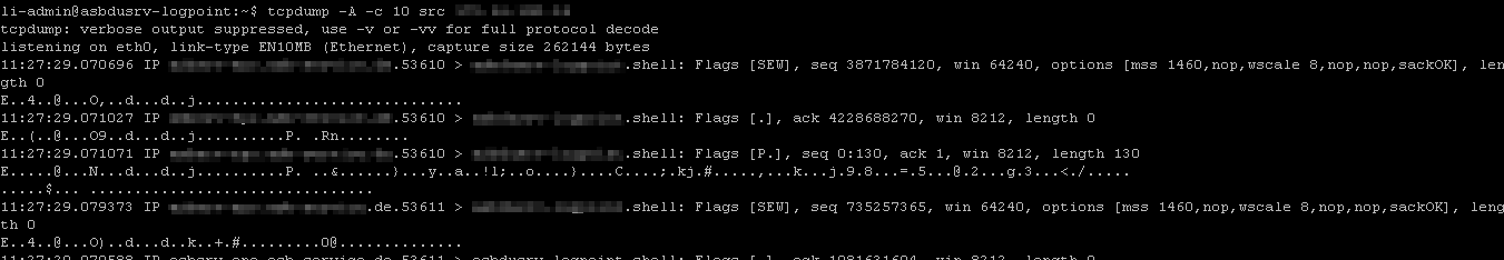 LP raw logs This is as far as i think not a problem with normalization, as a tcpdump also shows the log payload not being human readable.